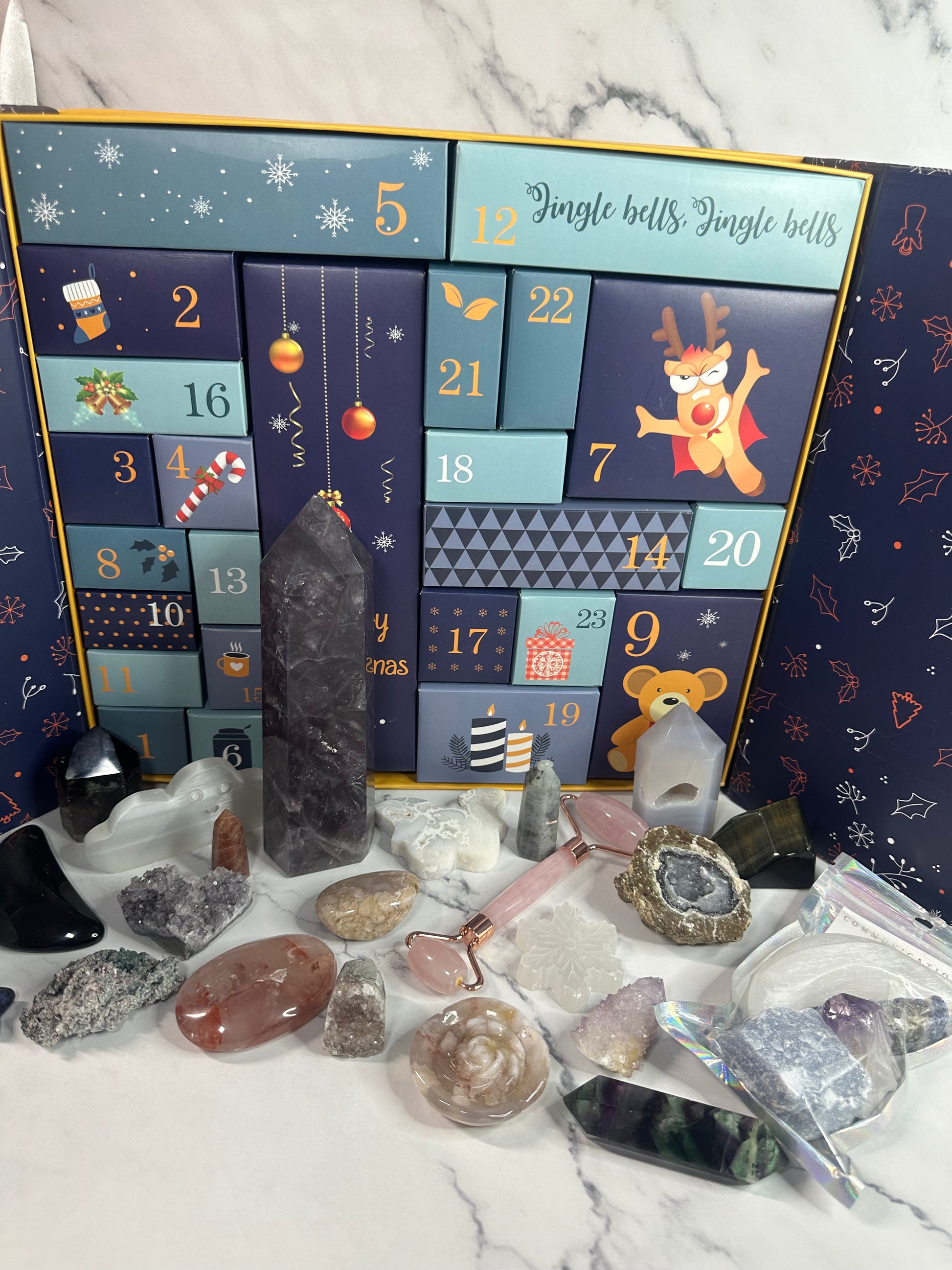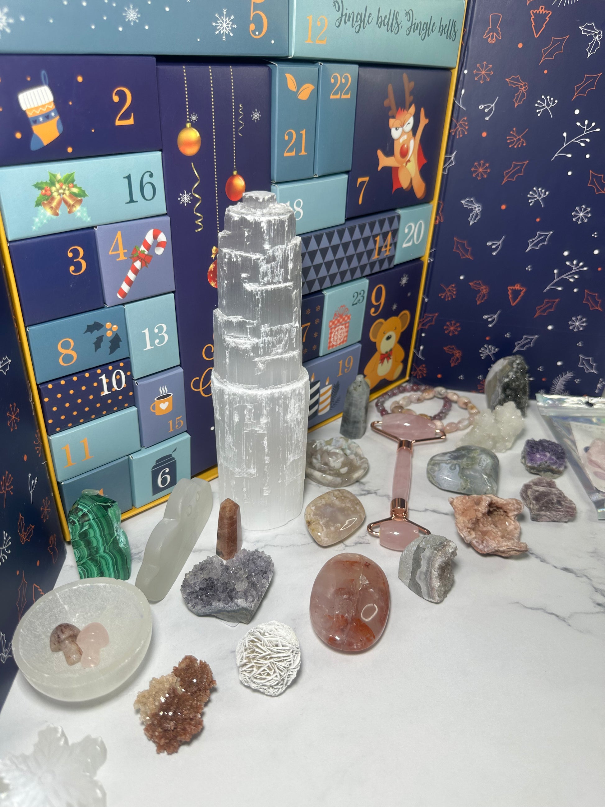 Let's bring on the Christmas spirit with this exciting 24-day advent calendar filled with a range of high-quality crystals to add to your starting out collection or your ever-so-growing beautiful collection. With limited tumbles and raws you will be excited to find a range of towers, statement pieces, carvings, slabs, clusters, jewellery, mini freeforms and overall an amazing selection of crystals.